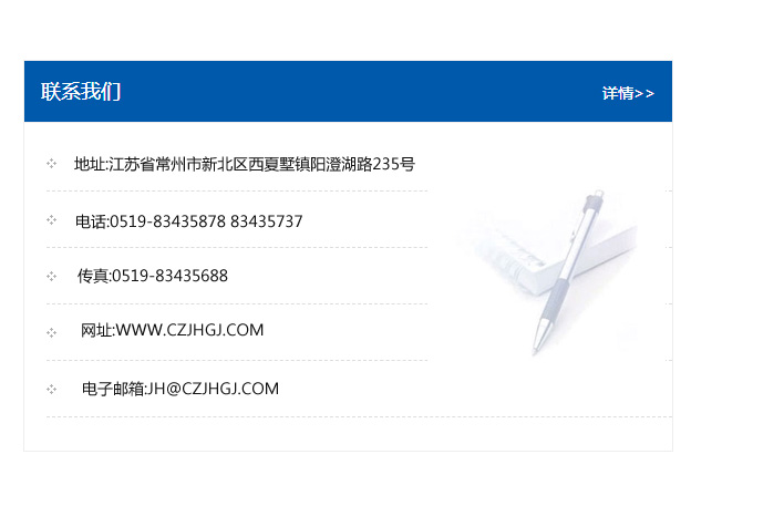 地址:常州市新北區友邦商務大廈1幢16、17層  電話:0519-85101652  傳真:0519-85112595  郵編:213022  網址:www_cz-jiayue_cn.lbsdsy.com  郵箱:xiajifengaa@163.com